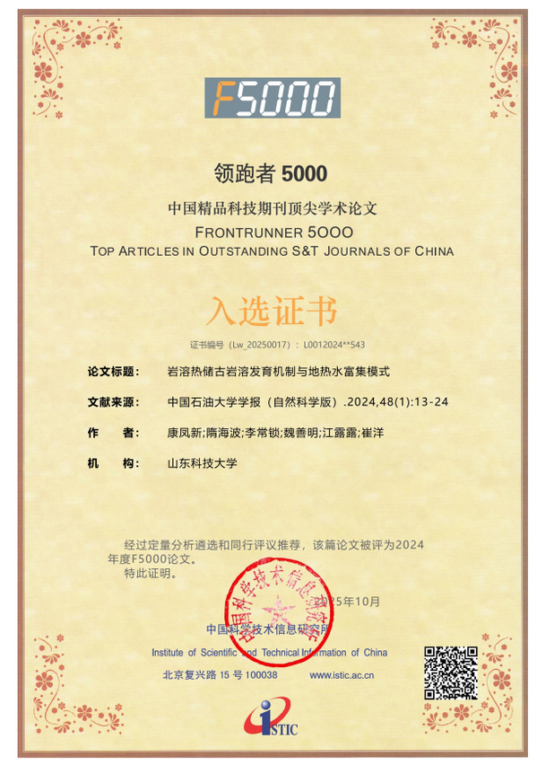 近日,中国科学技术信息研究所公布2025年度“领跑者5000(F5000)——中国精品科技期刊顶尖学术论文”入选名单。《bwin·必赢(中国区)官方网站-officialswebsi学报(自然科学版)》有2篇论文入选,分别为刘鑫、郝芳、柳卓等撰写的《川南自贡和泸州地区五峰组—龙马溪组一段页岩有机质富集机制》,康凤新、隋海波、李常锁等撰写的《岩溶热储古岩溶发育机制与地热水富集模式》。