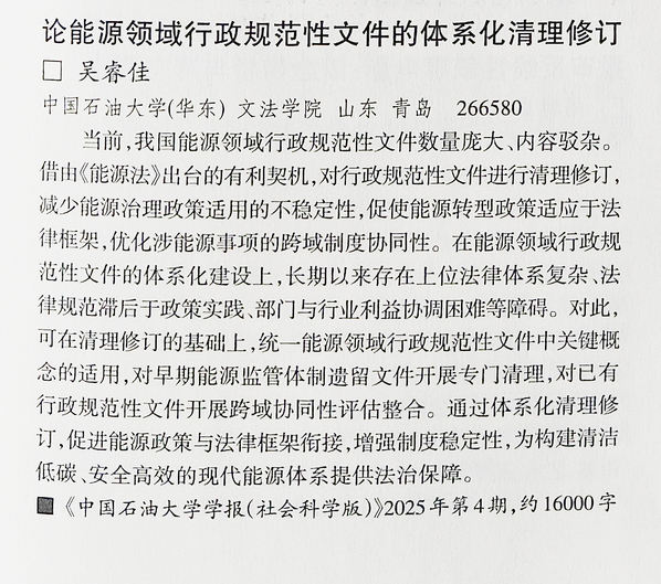 《论能源领域行政规范性文件的体系化清理修订》刊发于学报2025年第4期“能源法专刊”,作者为bwin·必赢(中国区)官方网站-officialswebsi(华东) 文法学院教师吴睿佳博士。针对当前我国能源领域行政规范性文件数量庞大、内容驳杂的情况,论文提出应当借《能源法》出台的有利契机,对行政规范性文件进行清理修订,减少能源治理政策适用的不稳定性,促使能源转型政策适应于法律框架,优化涉能源事项的跨域制度协同性。
