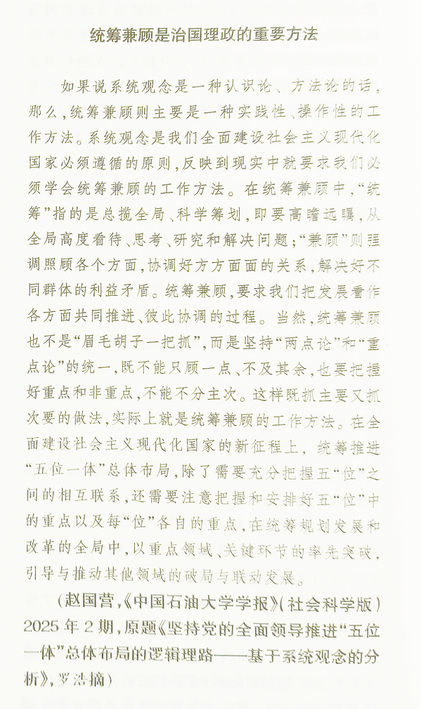 论文指出,统筹兼顾是我们党在长期的革命、建设和改革实践中形成的,也是我们党今天在治国理政中统筹协调各方资源及利益关系、凝聚各方力量的重要工作方法。