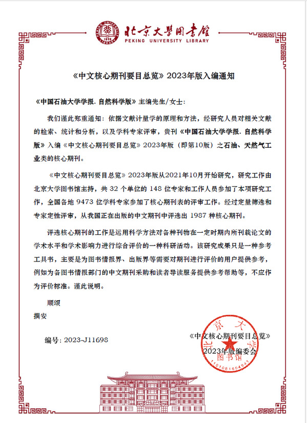 近日,《中文核心期刊要目总览》2023年版编委会发布通知,依据文献计量学原理和方法,经研究人员对相关文献的检索、统计和分析,以及学科专家评审,《bwin·必赢(中国区)官方网站-officialswebsi学报(自然科学版)》继续入编《中文核心期刊要目总览》2023年版(即第10版)之石油、天然气工业类核心期刊。