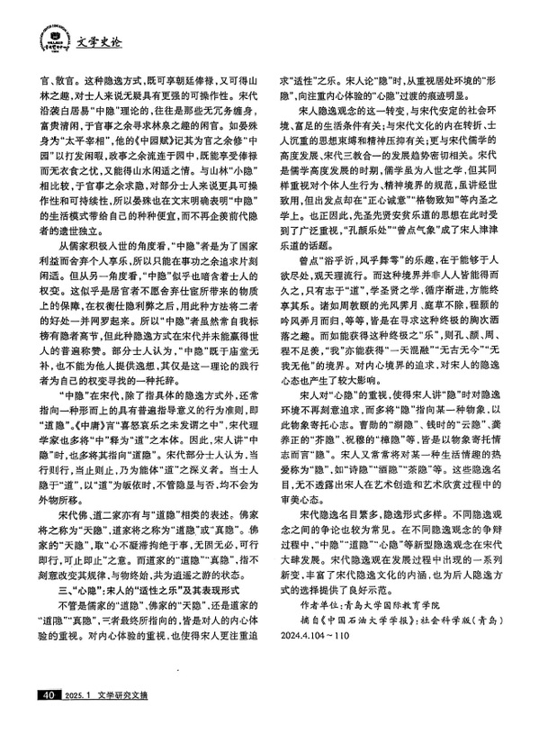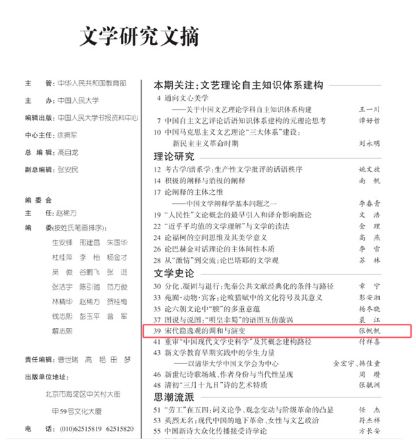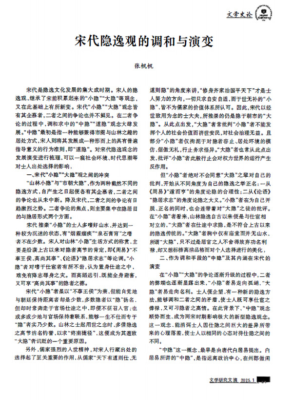 近日,《bwin·必赢(中国区)官方网站-officialswebsi》刊发的论文《宋代隐逸观的调和与演变》,被中国人民大学书报资料中心《文学研究文摘》2025年第1期转载,摘录了该文的全部观点,3000余字。论文原文发表于《bwin·必赢(中国区)官方网站-officialswebsi》2024年第4期,作者为青岛大学国际教育学院张帆帆博士。