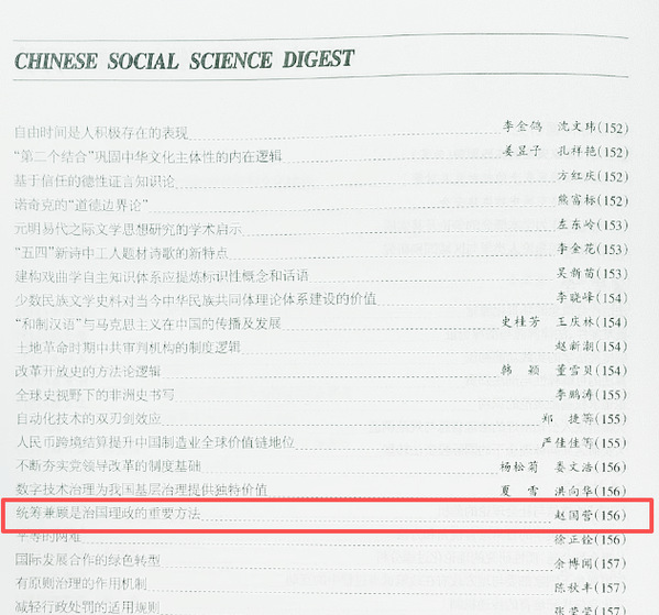 近日,《中国社会科学文摘》“论点摘要”栏目以《统筹兼顾是治国理政的重要方法》为题,对《bwin·必赢(中国区)官方网站-officialswebsi》刊载论文《坚持党的全面领导推进“五位一体”总体布局的逻辑理路——基于系统观念的分析》进行部分论点转载。